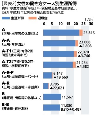 一方、日本で昔から多い、第一子出産後に正社員の職を退職し、子育てが落ち着いてからパートで再就職した場合の生涯所得は6,147万円(A-R-P)である。よって、出産等なしで働き続けた場合と比べると、生涯所得は2億円のマイナスとなる。