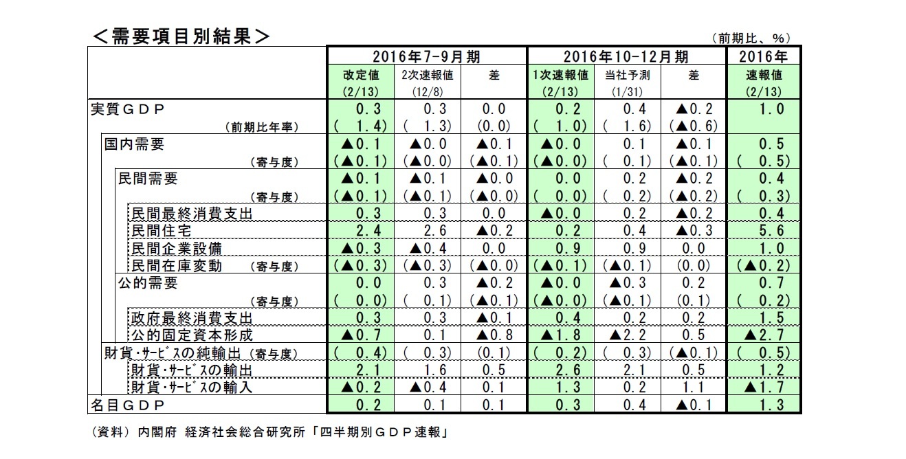 公的需要は、政府消費が前期比0.4%と2四半期連続で増加したが、公的固定資本形成が2015年度補正予算、2016年度当初予算の前倒し執行の反動から前期比▲1.8%と大きく落ち込んだ。