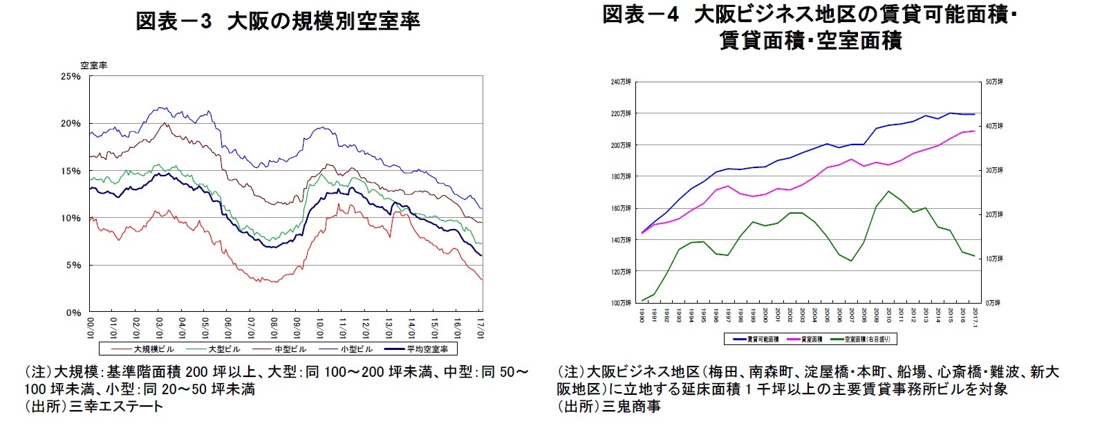 1 過去の大阪オフィス市況の見通しに関するレポートとしては、竹内一雅「需給環境の改善が続く大阪オフィス市場-活発な需要に加え新規供給の少なさが市況改善に貢献」(2016.11.7)ニッセイ基礎研究所、竹内一雅「大阪オフィス市場の現況と見通し(2016年)」(2016.3.4)ニッセイ基礎研究所などを参照のこと。