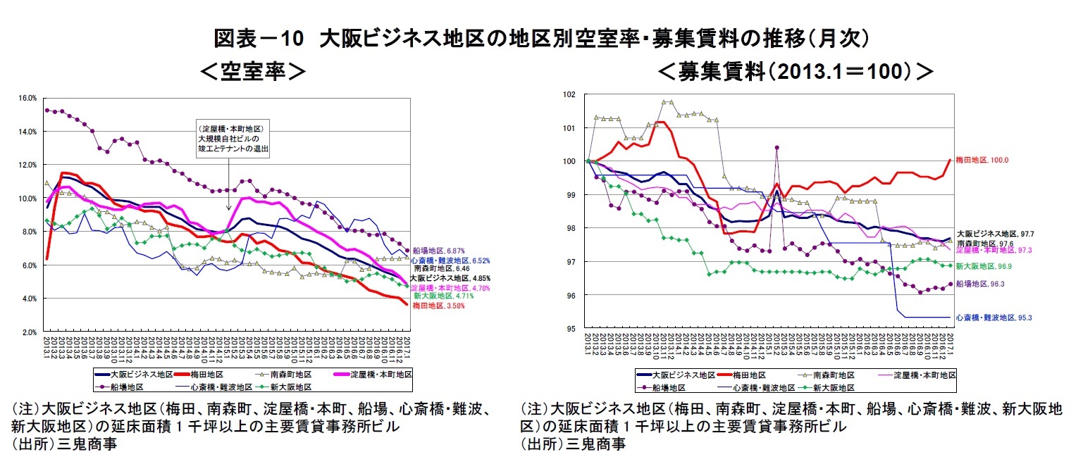 募集賃料(月次)は、梅田地区で上昇傾向にあるが、空室率の低下が顕著な淀屋橋・本町地区や船場地区でも、まだ募集賃料は底打ちしたといえる状況にはない(図表-10右図)。