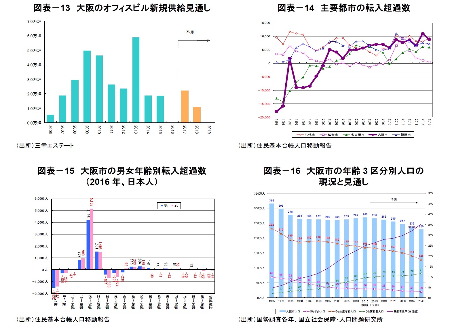 国勢調査によると、大阪市の2015年の人口は269万2千人で、2010年と比べ+2万6千人の増加となった(図表-16)。国立社会保障・人口問題研究所によると、2015年の人口は266万4千人と予測されており、東日本大震災以降の転入超過数の増加などが、予測を上回る人口増加を達成させたと考えられる。なお、2016年の大阪市の推計人口も270万2千人と増加が続いている。