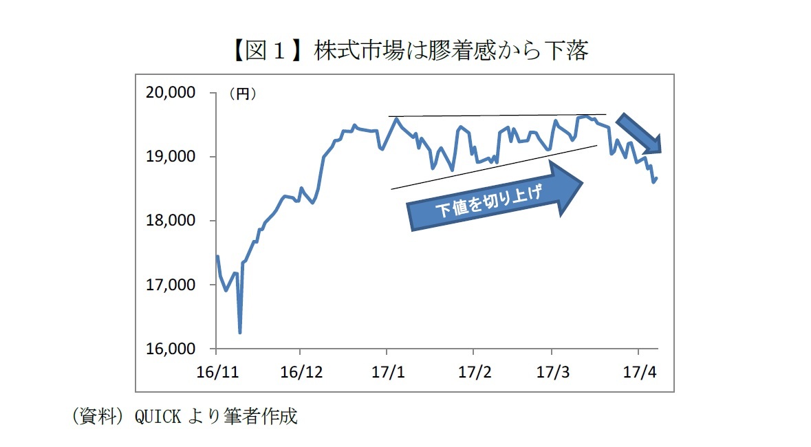 こうした中、図1のとおり3月中旬まで日経平均は徐々に下値を切り上げ、市場は先行きに強気な様子がうかがえた。幸い、オランダ下院選挙では極右派政党の議席数の伸びが限定的となったことで、ポピュリズム・反グローバル化の流れがフランス大統領選に波及する政治リスクへの懸念はひとまず後退し、「3月中の2万円回復」も意識させられた。