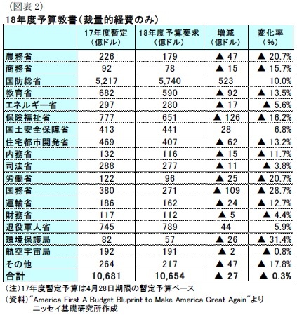 (2) 18年度予算:予算教書は、国防予算の大幅増額を要求。ただし、歳出上限の緩和は困難
