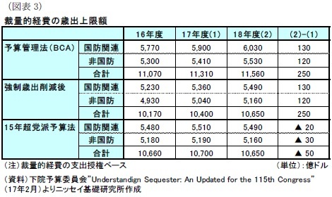 15年超党派予算法(Bipartisan Budget Act of 2015)では、16年度と17年度の歳出上限額を強制歳出削減で規定される金額より引き上げており、17年度の引き上げ幅は、国防関連および、非国防についてそれぞれ、150億ドルずつ、合計で300億ドルとなっていた。同法は、17年度で切れるため、18年度の歳出上限額は強制歳出削減が適用され、国防関連が5,490億ドル(前年度比▲20億ドル)、非国防が5,160億ドル(同▲30億ドル)となり、合計の歳出上限額は、今回トランプ大統領が提示した10,650億ドルとなる(図表3)。
