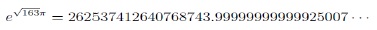例えば、以前の研究員の眼で紹介した、インドの数学の大天才シュリニヴァーサ・ラマヌジャン(Srinivasa Aiyengar Ramanujan)(1887~1920)は、いくつかの「ほとんど整数」を発見している。実際にはラマヌジャンが発見したわけでもないようだが、以下は、「ラマヌジャン定数」と呼ばれているようである。