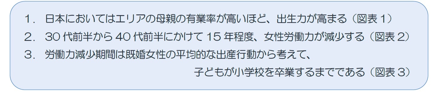 第3子までの平均出産年齢は30代前半である。平均的に、第1子で考えると0歳から15歳(中学卒業まで)、第2子で考えても0歳から13歳(小学校卒業)まで、労働市場からの女性の退出が生じている。
