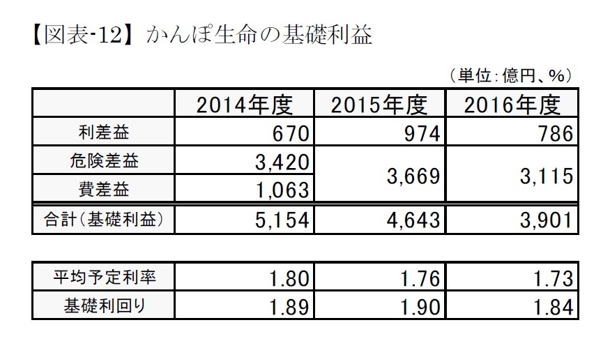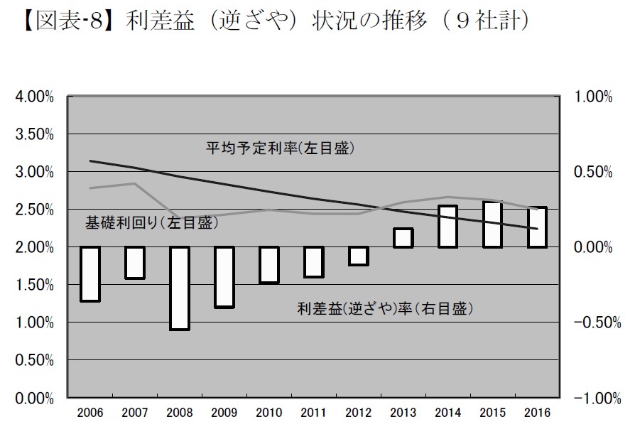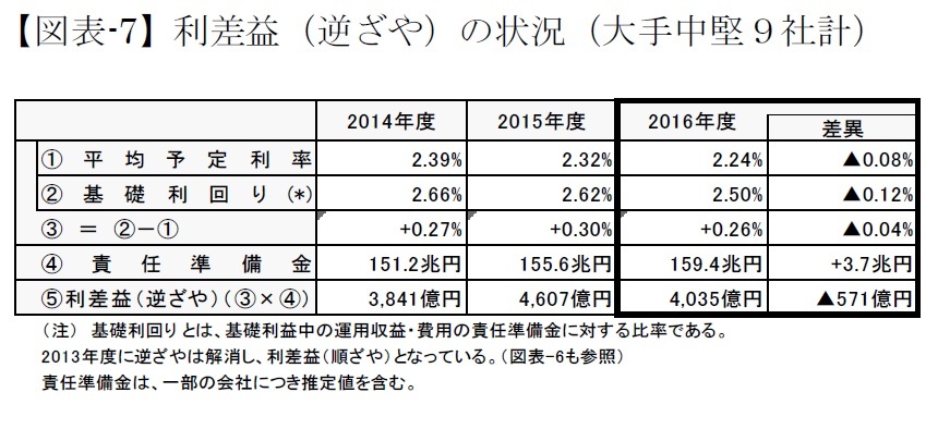 2008年度を底として、2012年度まで逆ざやであったものが、2013年度から利差益に回復し、2015年度には4,607億円の利差益となったが、2016年度は4,035億円へと減少に転じた(なお、個々にみると、一部の会社はまだ逆ざやである。)