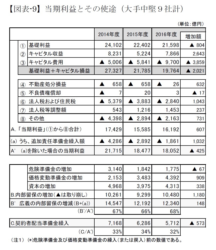 次に当期利益の動きである。基礎利益、当期利益ともに減少した。以下、当期利益を構成する、基礎利益、キャピタル損益、特別損益の状況を概観し、その後、当期利益の使途を見る。(図表-9)