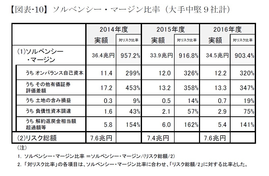ストックベースの健全性指標であるソルベンシー・マージン比率(9社合計ベース)をみたものが図表-10である。ソルベンシー・マージン総額と保有リスクとの関係を見るため、形式的に9社計で算出した比率は前年度の916.8%から903.4%へと若干低下したが引き続き高水準にある。