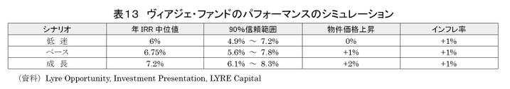 ヴィラージェ・ヴィアジェ社のファンドの目論見書では、配当率のモンテカロル・シミュレーションを、成長、ベース、低迷という3つのシナリオによって分析しており、90%の信頼で、税引き後に年5.6~7.8%のIRR(中位値)が得られるとして、機関投資家に説明している。このときの住宅価格の上昇率は年1%、物価上昇率も1%なので、住宅の実質価格は横ばいを続けることを想定している(表13)。