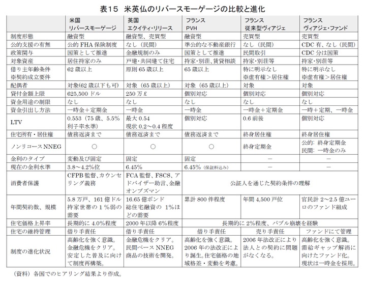 これまで長きにわたり各国におけるリバースモーゲージ制度の研究が行われてきたが、以上のように、わが国では米英仏と比べうるような商品化はまだ行われていない。今後、高齢者の資金需要は急速に高まるはずであり、米英仏におけるリバースモーゲージ等の商品の進化やチャレンジを参考に、わが国でも従来にはないリバースモーゲージ等の商品を創出していくことは引き続き大変重要な課題と考えられる。