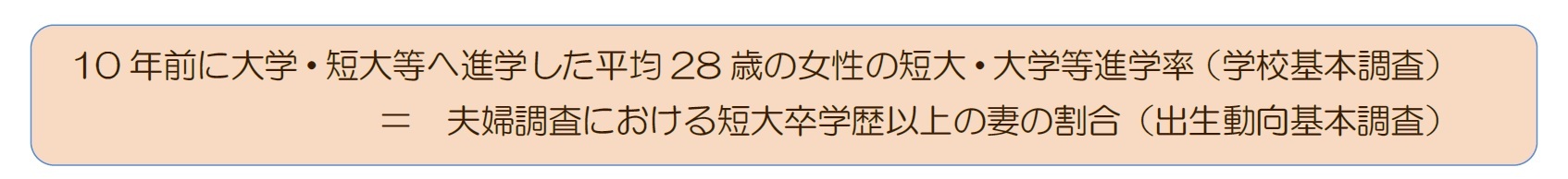 つまり、結婚というライフイベントのおよそ10年前の短大以上進学率と比較して、高学歴が女性に与える影響については見なければならない、ということになる。