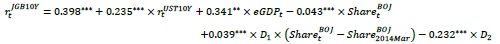 この結果から、過去1年間はYCCにより日本国債金利(10年物)はゼロパーセント近辺を推移してきたが、海外の金利市場や国内経済のマクロ要因によって生じた金利上昇の圧力を、日本銀行による国債買入によって抑制してきた状況が垣間見える。