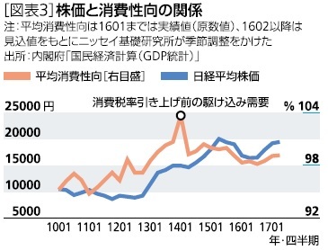 2016年中はマイナス金利導入に伴う消費者心理の悪化、株価の下落、相次ぐ台風上陸などの天候不順、生鮮野菜の高騰に伴う節約志向の高まりなどが消費性向の押し下げ要因となっていたが、2017年入り後はこうしたマイナス材料が比較的少ないこと、株価の上昇傾向が続いたことが消費性向の押し上げに寄与しているものと考えられる[図表3]。