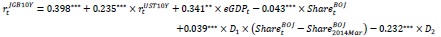 第3項は、日本のマクロ経済に関する代表的な指標として実質GDP成長率予想(eGDPt)を採用しており、係数は正であることが予想される。実質GDP成長率予想が1%上昇すると日本国債金利(10年物)は0.051%上昇することを意味している。