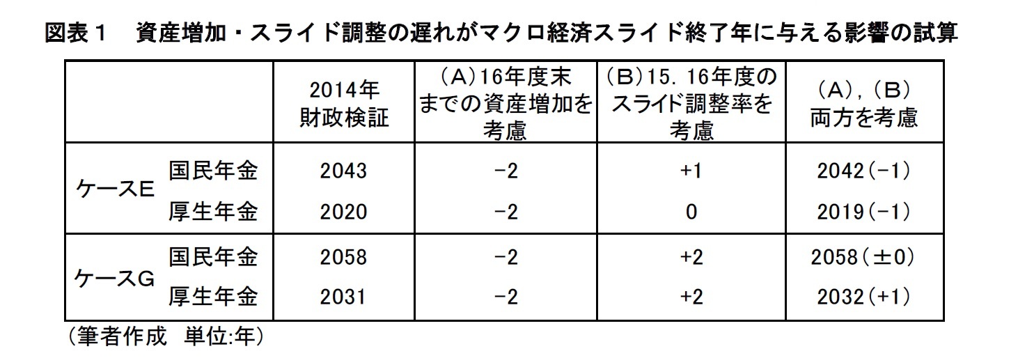では、積立資産の増加、給付調整の遅れという2つの要因は、マクロ経済スライドの終了時期にどの程度の影響を与えるのであろうか。ここで運用利回りなど2017 年度以降の前提に関しては2014 年財政検証の数値を用いて、スライド終了年がいつになるか、簡単に試算してみた。その結果、図表1のように積立資産の増加の影響だけをとると、ケースEでは国民年金・厚生年金ともそれぞれ2年ずつ短縮され、ケースGでもほぼ同様であった2。他方、給付調整の遅れはスライド調整を遅らせる。2つを総合するとケースEではスライド終了年が財政検証より1年程度早くなり、ケースGではむしろスライド終了が1年程度遅くなる結果となった。