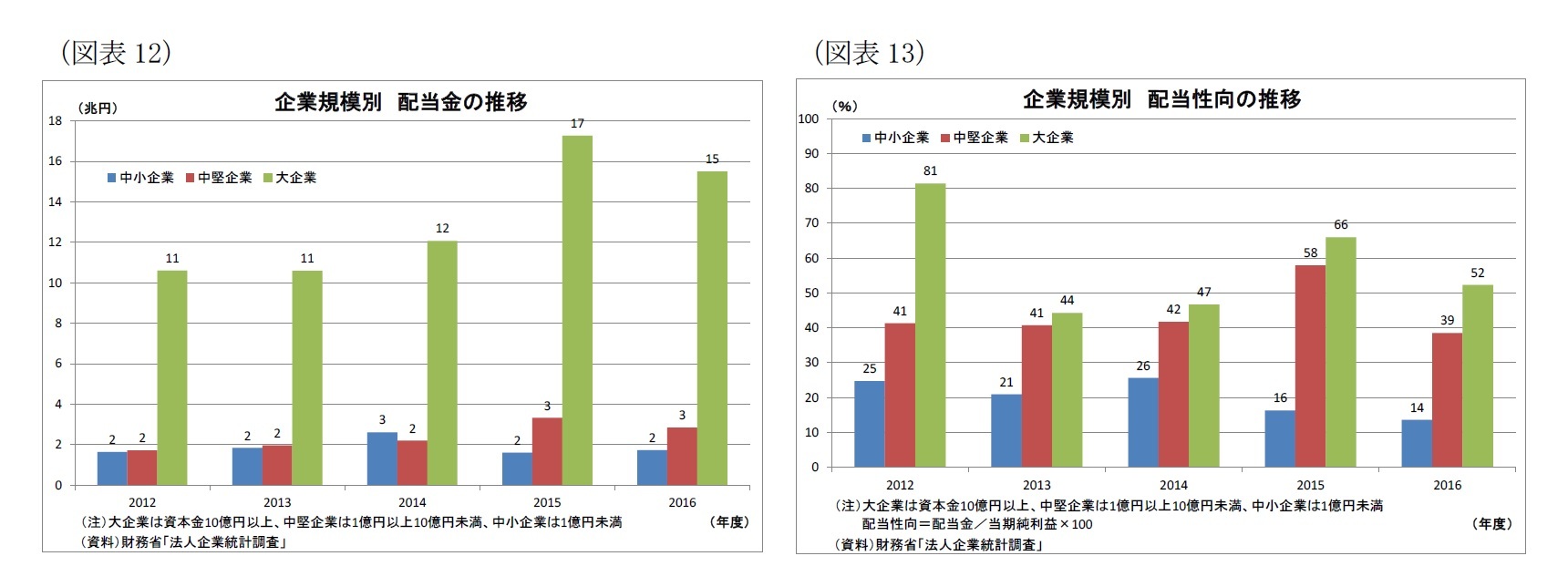 一方、B/S上で大きく増加しているのが投資有価証券であり、2016年度末残高305兆円は2012年度末から69兆円増加している(図表15)。企業規模別でみると、特に大企業で45兆円増と大きく増加(中小企業は20兆円増)している。大企業は、国内での設備投資を抑える一方で、高い成長が見込まれる海外で稼ぐために海外関係会社への投資や海外企業のM&Aを積極化しており、その結果、投資有価証券の残高が大きく増加したとみられる。