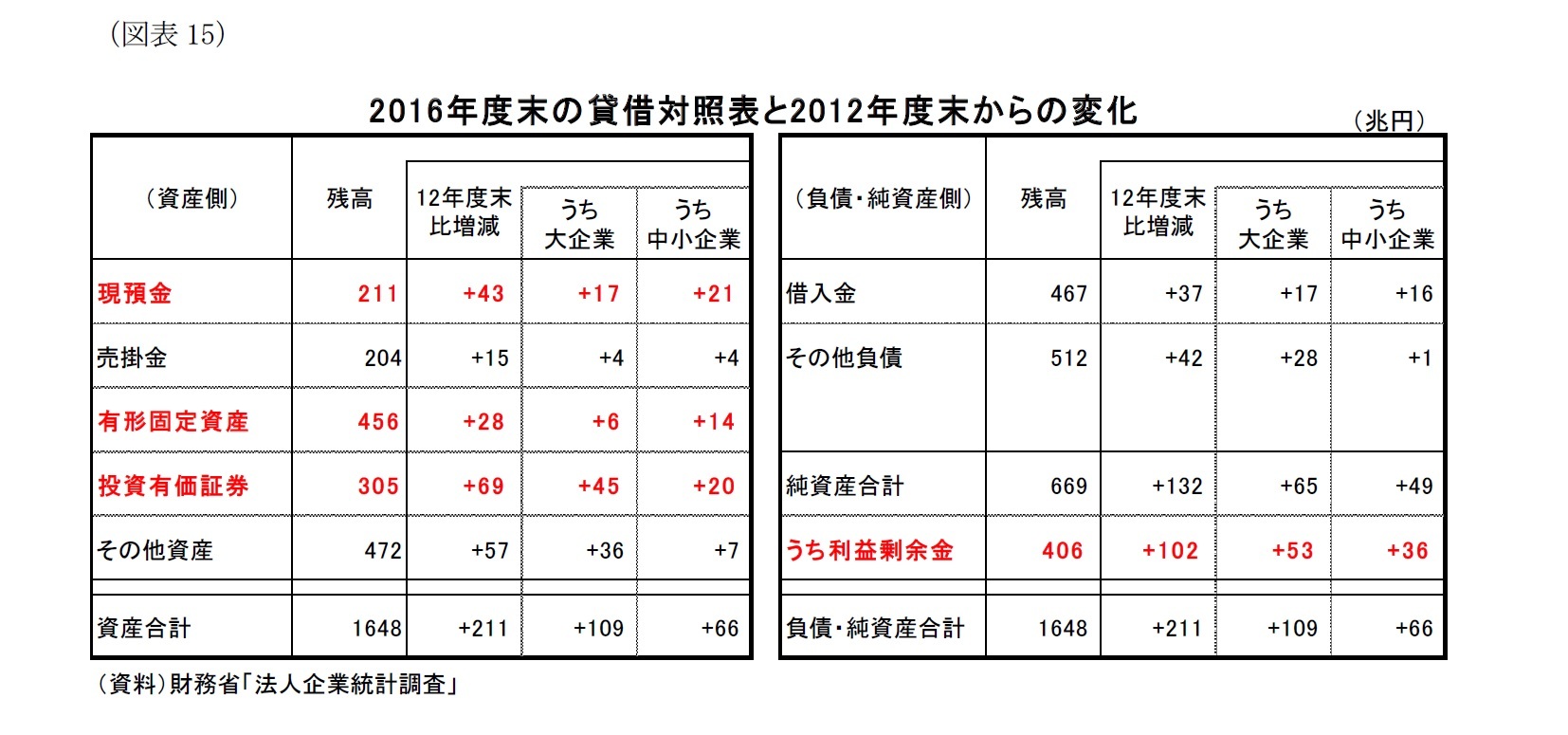 そこで、2016年度末の貸借対照表(以下、B/S)を2012年度末時点と比較してみると(図表15)、この間に負債・純資産サイド(資金調達サイド)は、利益剰余金(102兆円増)や借入金(37兆円増)などで211兆円増加した。この211兆円が各資産に分配されて運用されているわけだが、主に増加しているのは、投資有価証券(69兆円増)や現預金(43兆円増)であり、工場設備や店舗といった(国内)有形固定資産の増加は28兆円に留まる。