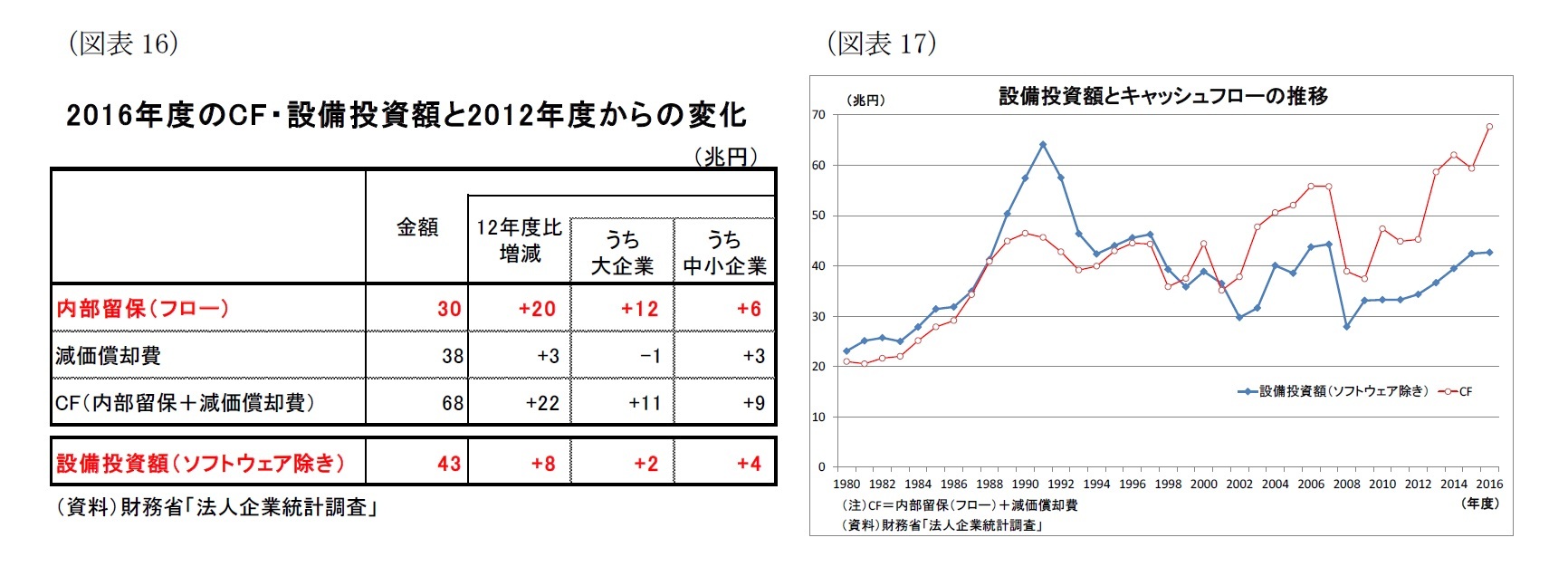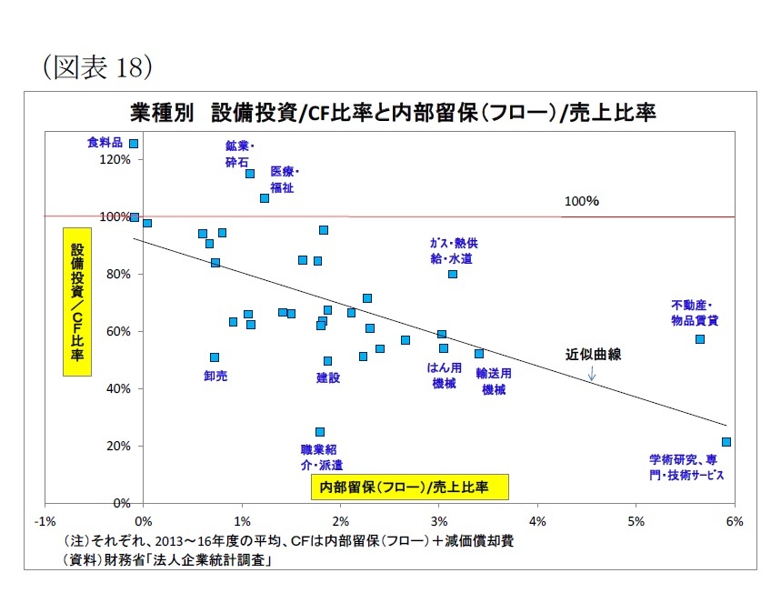 ただし、キャッシュフロー(以下「CF」、内部留保(フロー)+減価償却費)との対比では、設備投資は力強さに欠ける。企業のCFは2012年度から16年度にかけて、内部留保(フロー)の増加に伴って22兆円増加したが、設備投資額の増加は既述のとおり8兆円に留まっている(図表17)。