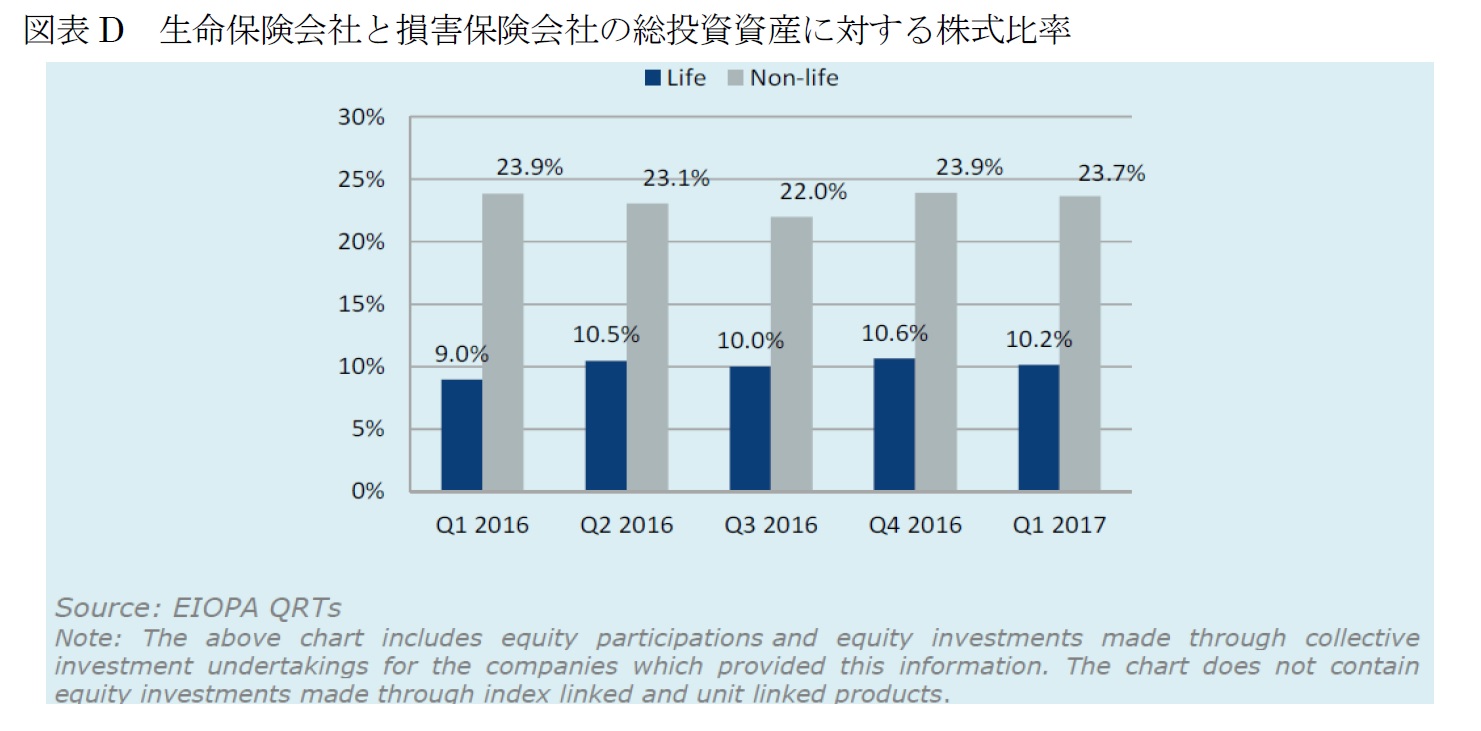 ・損害保険会社の総投資資産に対する株式比率は比較的高く、2016年第1四半期から2017年第1四半期において22%から24%に増加している。