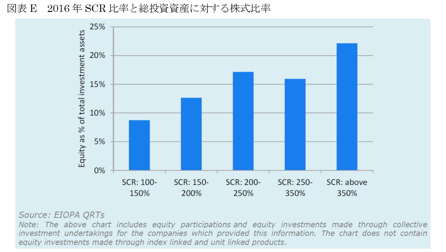 株式は、例えば、 SCRのカバレッジ計算の際に、株式投資と保険会社のSCR比率の関係を見極めることが重要である。図Eは、総額ベースで、株式投資の比率は資本の充実した企業でより高いと思われることを示している。それにもかかわらず、株式への投資の増加は、異なるビジネスモデルなどの他の理由に起因する可能性がある。