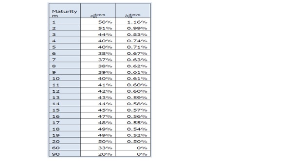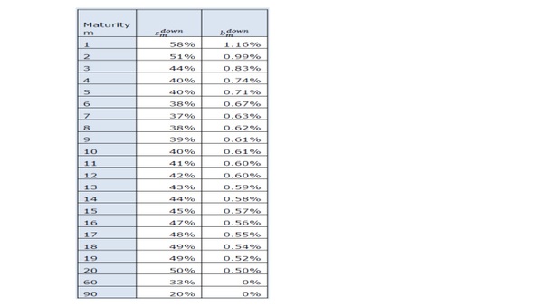 805.上記の表に記載されていない満期については、smdownと𝑏𝑚𝑑𝑜𝑤𝑛 の値は直線補間される。満期が1年未満の場合、smdownと𝑏𝑚𝑑𝑜𝑤𝑛 の値はそれぞれ58%と1.16%になる。60年より長い満期については、𝑏𝑚𝑑𝑜𝑤𝑛 の値は0%とする。90年より長い満期の場合、smdownの値は20%に等しくなる。
