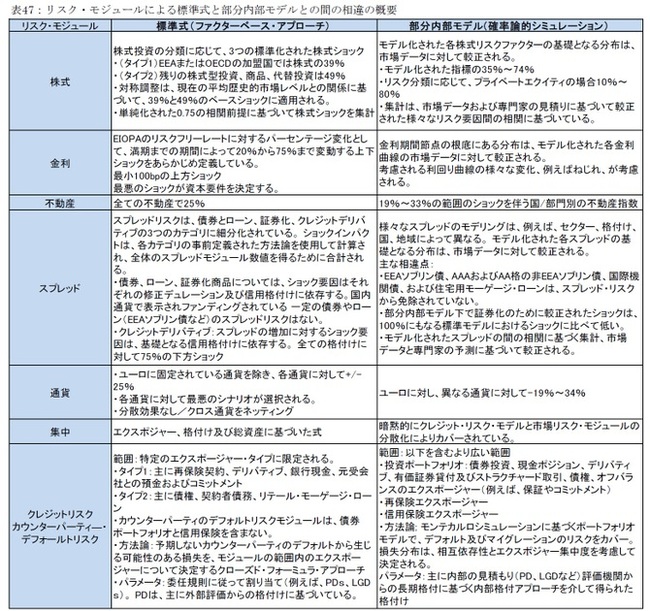 次の表は、標準モジュラーとリスクモジュールによる部分内部モデルの違いの概要を示している。