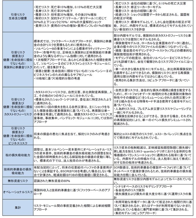 ■生命リスク:内部モデルは、その他の顧客行動や医療費を明示的にモデル化している。改定リスク(即ち、保険契約者の健康状態における変化によるリスク)はグループにとって重要でないことから、内部モデルのデフォルトではモデル化されていないが、(就業不能リスクに埋め込まれて)ローカルレベルでは考慮に入れることができる。解約リスクは、内部モデルと標準式の両方において、3つの要素(解約の増加、解約の減少及び大量解約)に分けられるが、集計が異なっている(内部モデルにおける集計マトリックスに対して、標準式における3つの要素の最大値)。