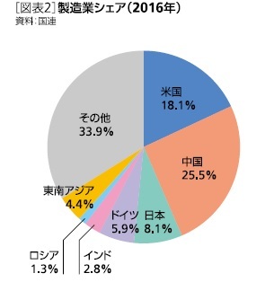 他方、グローバリゼーションが進む中で、世界の製造業が賃金の高い米国にあった工場を海外に移転させたため、世界の製造業に占める米国のシェアは18.1%まで低下した。1970年には29.7%、1990年には23.1%だったことを考えると急激な落ち込みだったことが分かる。一方、米国より遥かに賃金が低く豊富な労働力を抱える中国はその受け皿となり、また外資系企業が使い易い工業団地や物流網を積極的に整備したこともあって、世界の製造業は中国に工場を移転し、中国は「世界の工場」となった。そして、世界の製造業に占める中国のシェアは25.5%と世界の4分の1を占めるに至り、米国は製造業で世界第1位の地位を中国に明け渡すこととなった[図表2]。