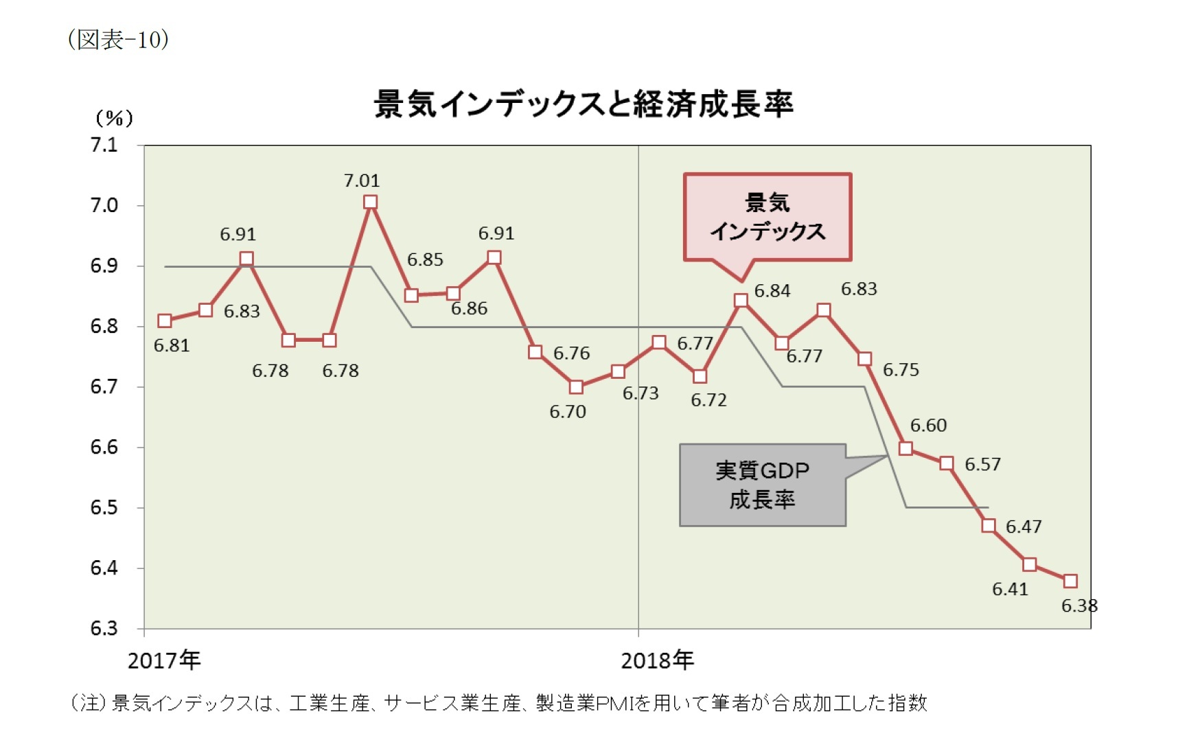 ちなみに、その推計結果と経済成長率の関係をみると(図表-10)、17年以降おおむね6%台後半で推移していた「景気インデックス」は、18年5月の6.83%を直近ピークとして低下し始め、9月には6.47%と18年の成長率目標である「6.5%」をやや下回り、その後も10月は6.41%、11月は6.38%と低下傾向が続いている。ご参考になれば幸いです。