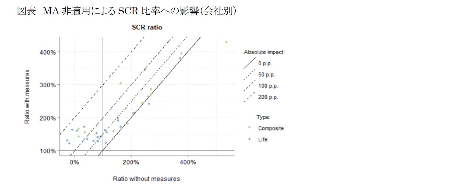 以下の図表は、この方法を使用した全ての会社のSCR比率に対するMAの非適用の影響を示している。 図中の各点は、個々のSCR比率をMA非適用の場合の推定SCR比率と比較した1つの会社を表している。各会社の種類は点の色で示される。SCR比率では、71%の会社が0%から100%の間の絶対的な影響を報告した。MAを適用している会社の41%(14の会社、EEAの総技術的準備金の10%)が、MA非適用のSCR比率が100%を下回っていると報告した。また、MAを適用している会社の9%(3つの会社、EEAの総技術的準備金の0.4%)が、MA無しでSCRをカバーするための負の適格自己資本を報告した。MAについては、生命保険会社と生損保兼営会社の間に明確な違いはない。