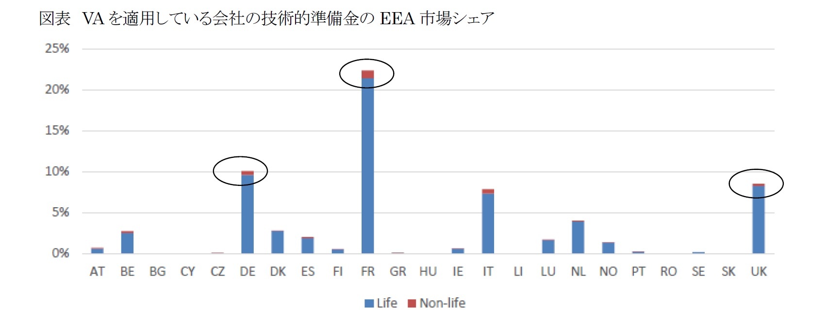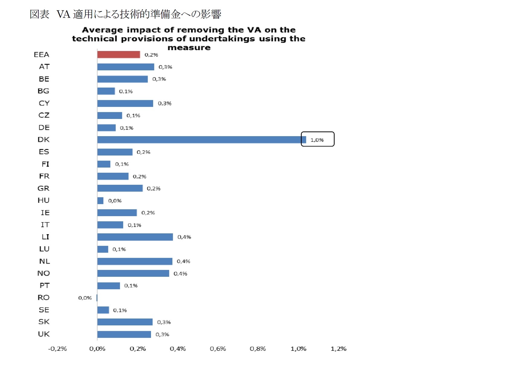 VAを適用している会社の96%の絶対的な影響は0%から50%の範囲内となっている。また、会社数の1%に相当する8社(技術的準備金の市場シェアで0.6%)がVAを適用しない場合、SCR比率が100%未満となる。なお、VAを適用しない場合、適格自己資本がマイナスになる会社はない。