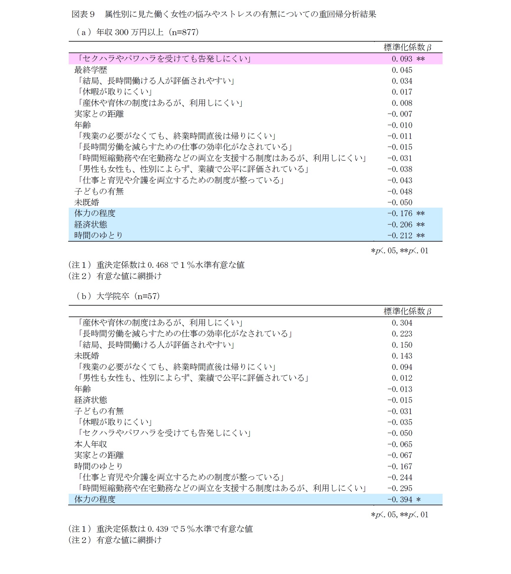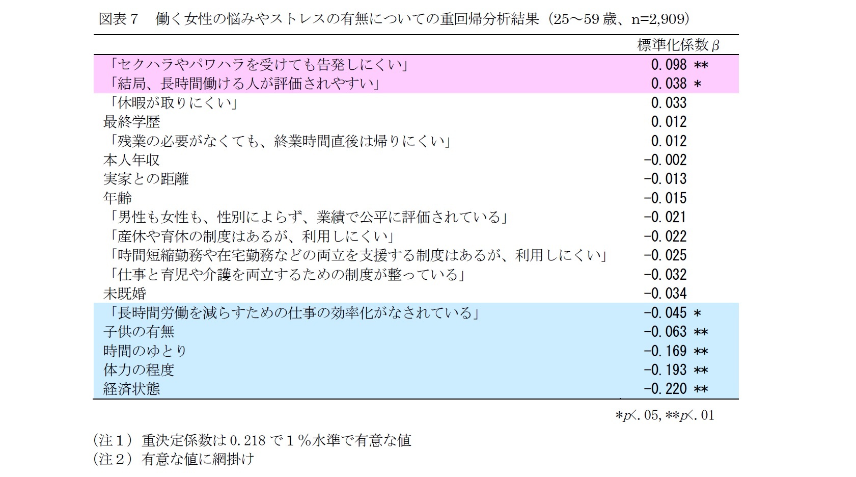 また、高学歴や高収入のハイキャリア女性では経済状態よりも体力や時間の余裕、職場の状況が悩みを増やす影響があった。職場の状況については、就業女性全体でも「長時間労働を減らすための仕事の効率化がなされている」職場や「仕事と育児や介護を両立するための制度が整っている」職場などでは悩みを減らす傾向がある一方、「セクハラやパワハラを受けても告発しにくい」職場や「結局、長時間働ける人が評価されやすい」、「休暇が取りにくい」職場では悩みを増やす傾向がある。