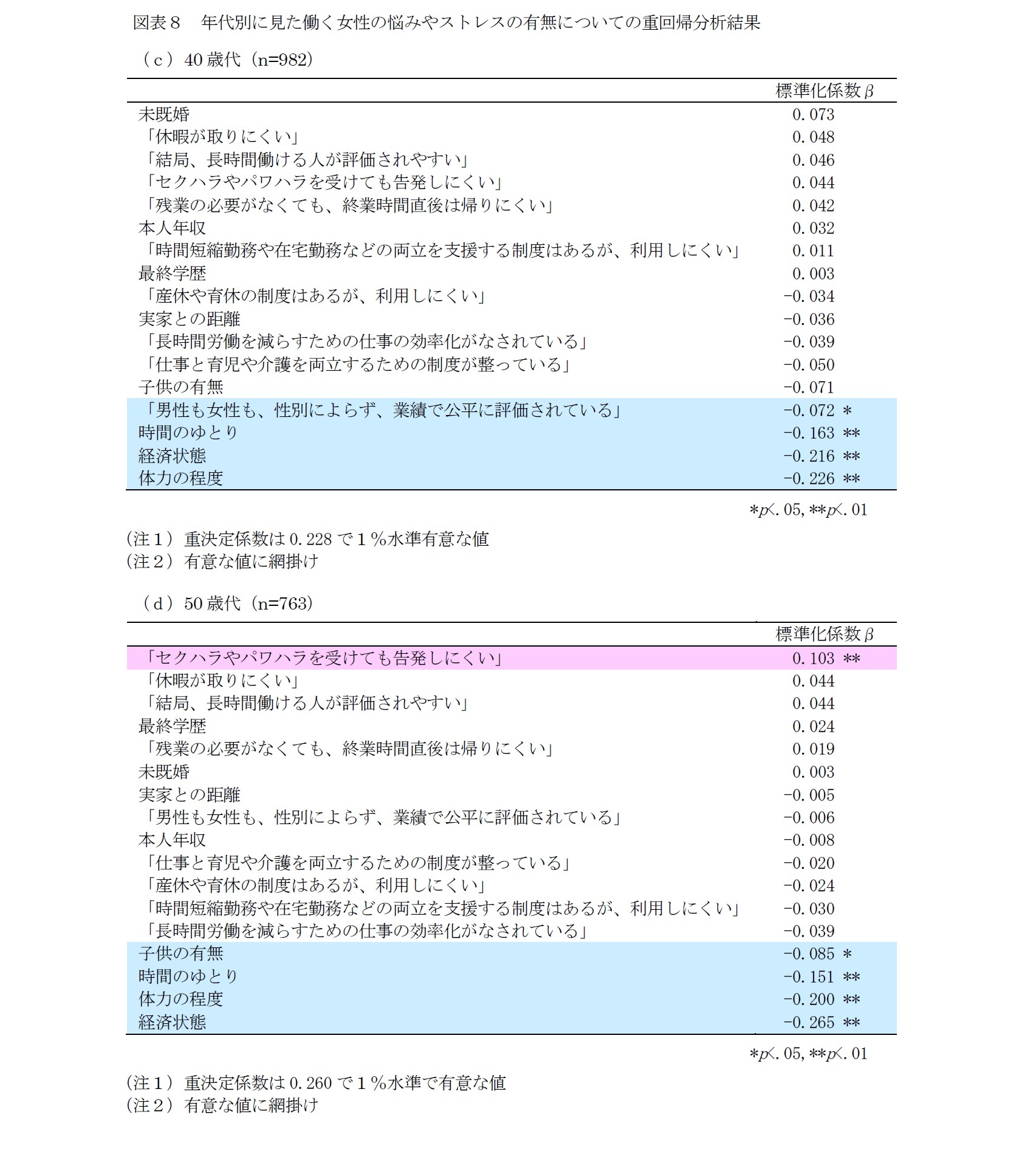 また、40歳代では「男性も女性も、性別によらず、業績で公平に評価されている」職場であることが唯一、有意な値で悩みを減らす影響を示しており、男女の不公平感に対する不満の多い年代(不満に直面している年代)である様子もうかがえる。