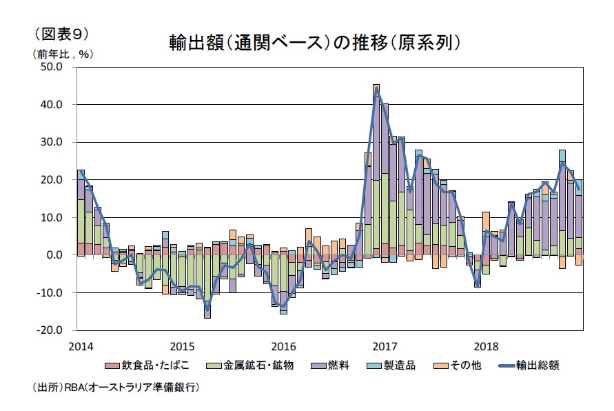 住宅投資の落ち込みによって、民間固定資本形成は弱含んでいる。10-12月期の住宅投資は4四半期ぶりのマイナス成長であったが、住宅の先行指標である住宅着工許可件数は2018年半ばから減少傾向が続き、未だに下げ止まっていないため、住宅投資の落ち込みは当面の間、継続するだろう。また、設備投資についても、企業の短期景況見通しを示す企業信頼感指数の悪化傾向が継続しており、設備投資意欲が低下していると予想される。一方で、公的固定資本形成については、2018/19年度(18年7月1日)から大規模なインフラ投資計画6が開始されており、下支えすることが期待される。