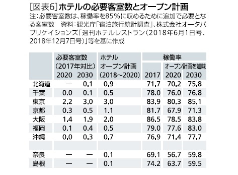 すでに大阪は2.0万室、東京は3.0万室のホテルが2020年までにオープンする計画が見込まれており、2030年時点で必要となる客室数に匹敵している。オープン計画を加味すると東京、大阪の稼働率(2020年)は80%前後と高水準を維持しており、急増する需要に見合った計画といえる。2030年にかけても需給が逼迫した状況が続きそうだ。一方で、京都は2017年の客室数2.7万室に対して、41%増に相当する1.1万室のホテルが2020年までにオープンする計画となっており、供給過剰となる恐れがある。計画を加味した稼働率は67.9%と7割を割り込む水準まで大幅に低下している。ただ、京都市を訪れた訪日外国人の約3割は大阪府に宿泊*2しており、需給が逼迫している大阪から宿泊客を取り込める余地がある。