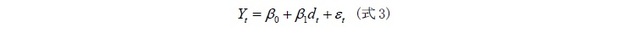 ここで、 Ytは、政策を実施したことにより影響を受ける変数である。dtは、政策の影響を受ける対象であれば1で、政策の影響を受けない対象であれば0となるダミー変数である。εtは誤差項であり、β0とβ1は推計するパラメーターである。この式による推計結果を用いて、ある政策を実施することによりYが増加したという解釈をすることは可能である。しかしながら、Yが増加した要因が、すべてある政策によるものかどうかは断定できない。例えば、一部の市町村のみある産業政策を実施することにより、該当する市町村の一人当たりGDPが増加したとしても、それがすべて政策の効果であるとは言い切れない。つまり、その効果には政策による効果のみならず、時間が変化することにより発生する外生的要因(time effect)が含まれている可能性もある。そこで、このようなことをコントロールして分析できる差分の差分法を使用することが望ましい。差分の差分法(Difference in Difference Analysis, DID 分析)では、政策の影響を受けるトリートメントグループと、政策の影響を受けないコントロールグループという 2つのグループに分けて分析を行う。つまり、純粋な政策の効果だけを見るために、政策により影響を受ける対象(トリートメントグループ)のみならず、時間が経っても政策の影響を受けない対象(コントロールグループ)を一緒に分析に利用する必要がある。