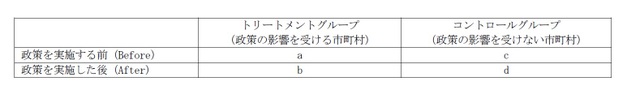 上記の表を用いて説明すると、トリートメントグループ(政策の影響を受ける市町村)の政策の実施前後の効果(b-a) には、政策の効果のみならず、時間が経つことにより発生する外生的要因も含まれていると言える。一方、コントロールグ ループ(政策の影響を受けない市町村)の政策の実施前後の効果(d-c)には、時間の変化による外生的効果だけが反映 される。ということは、(b-a)から(d-c)を除くことにより、時間の変化による外生的効果を除いた、純粋な政策効果が推計されることになる。但し、一つ注意すべきことは、外生的効果はトリートメントグループとコントロールグループともに 同じであると仮定する必要がる。これが差分の差分法の主な内容である。