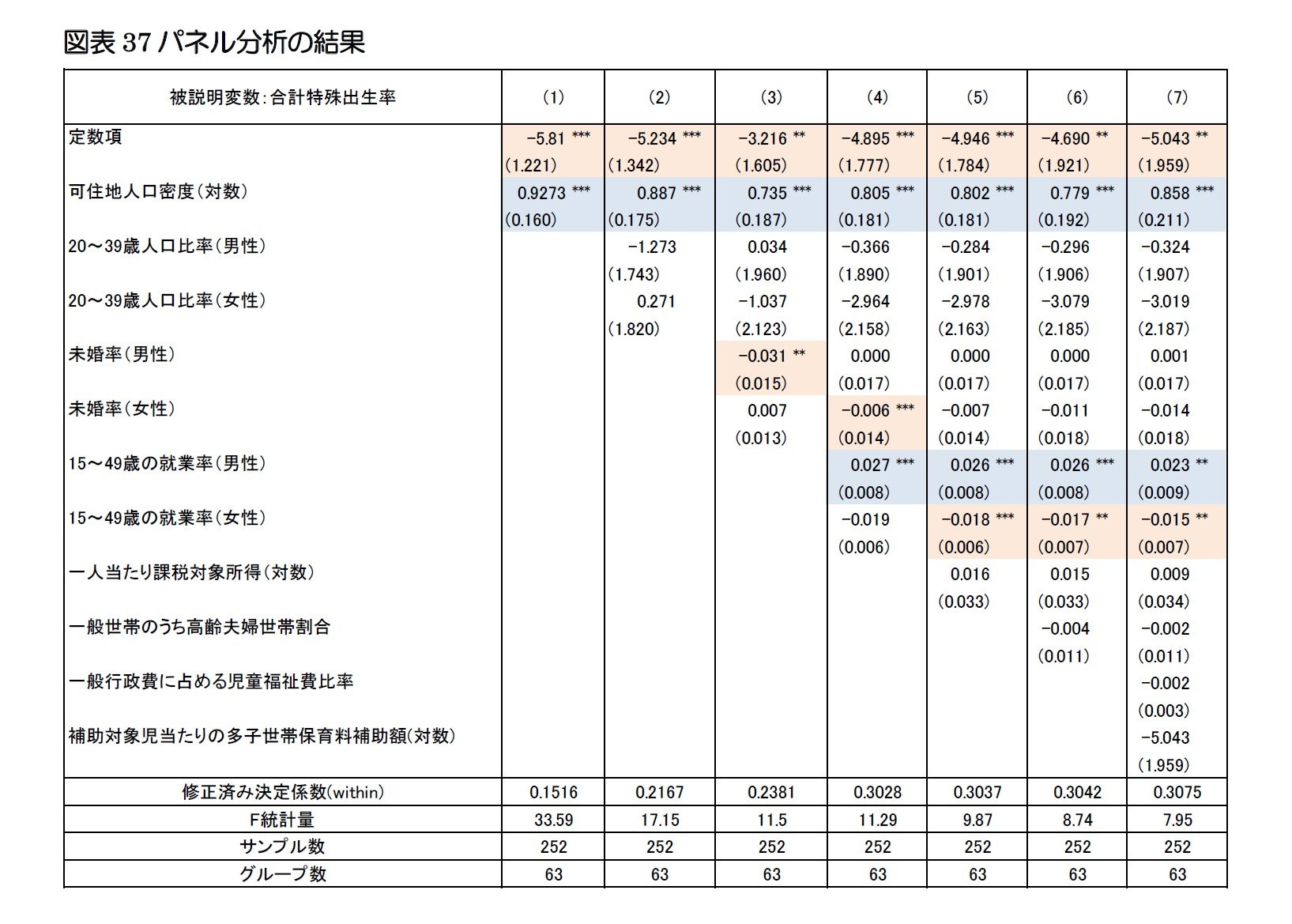 ハウスマンテストの結果、帰無仮説(誤差項は説明変数と相関がない)が棄却されたので、固定効果モデルを用いて分析を行った。分析では、回帰分析と同様に20歳~39歳人口比率、未婚率、15~49歳の就業率、一人当たり課税対象所得(対数)、一般世帯のうち高齢夫婦世帯比率、一般行政費に占める児童福祉費比率、補助対象児当たりの多子世帯保育料補助額を順次入れて分析を行った。分析の結果は図表37の通りであり、可住地人口密度(対数)が高い市町村と15~49歳の就業率(男性)が高い市町村で出生率が高いという結果が出た。