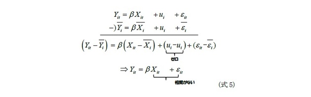 6 固定効果モデルでは、個体ごとのダミー変数を用いる代わりに、個体ごとに期間平均値からの乖離をとった推定式を利用することで、時間を通じて変化しない固有効果を除去する。