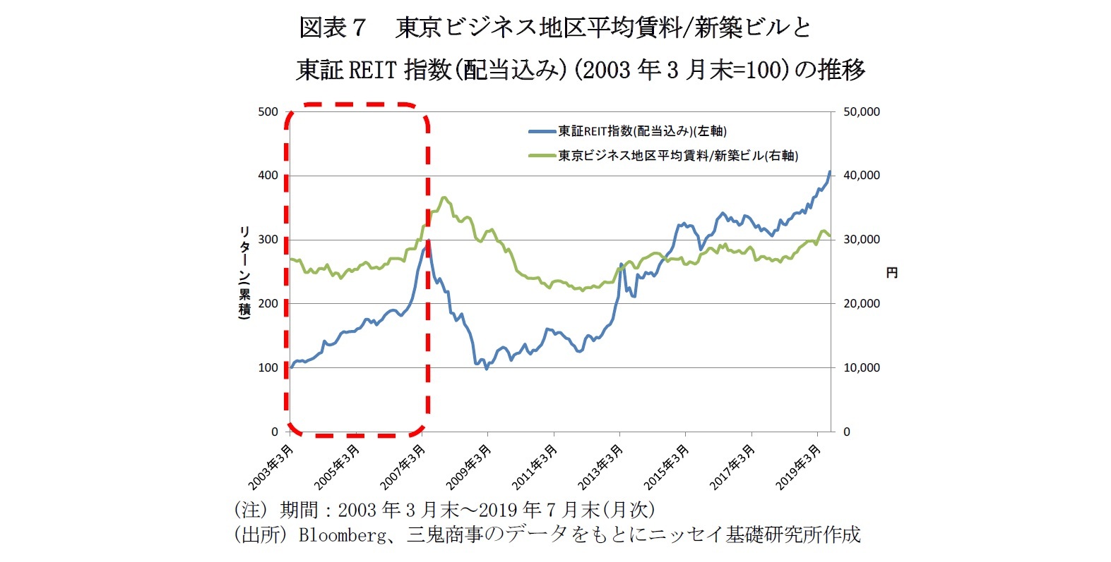不動産市場の代表的な指標として、三鬼商事が公表する「東京ビジネス地区平均賃料(以下、東京オフィス賃料)」が挙げられる。東京オフィス賃料は、東京都心5区に所在する基準階面積100坪以上の主要貸事務所ビルの募集賃料を集計した指標(全体、新築ビル、既存ビル)である。J-REITの保有物件はオフィスビルが中心であり、東京都心5区に所在する物件が多い。東京オフィス賃料が上昇した場合、東証REIT指数も上昇すると考えられる。従って、東京オフィス賃料と東証REIT指数の相関係数はプラスの符号が想定される。なお、両者の関係を分析したところ、新築ビル賃料(1ヶ月先)との相関が高いため、分析ではこの値を説明変数として用いることとした。