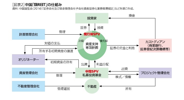 中国では住宅及び商業不動産開発の不均衡を是正するとともに、健全な住宅投資を促す市場形成のために、REITに対する制度整備が必要ではないかという指摘や議論が10年以上前から続いてきた。2005年に商業部は「全国商業地産運行報告」で、「REIT融資を開放する」という方向性を提示し、2008年、中国国務院が不動産市場の発展を促進するため、「不動産信託投資基金を試験的に展開する」を提出し、中国でREITを導入する方針を明確化した経緯がある。こうして、2014年に中国では初の類REIT商品が発行された。しかし、現存の類REIT商品は私募ベースであるため、不動産市場への影響はかなり限定的と言える。