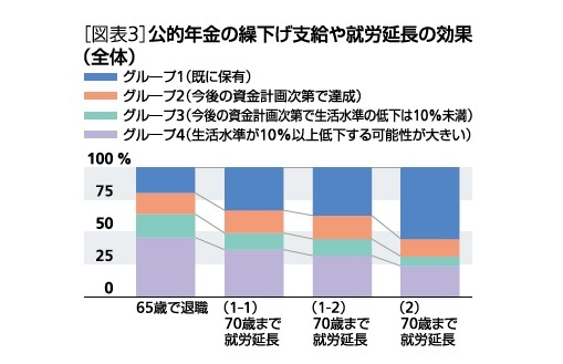 就労パターン別の各グループの構成割合は図表3の通りである。1番左は65歳で退職すると同時に公的年金の受給を開始する場合を示しており、右側3つは70歳まで働き退職と同時に公的年金の受給を開始する場合を、就労パターン別に示している。