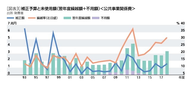 また、補正予算が成立しても消化しきれないという問題もある。日本の予算は単年度主義となっており、予算によって認められた国費の歳出期限が及ぶのは原則として当年度限りである。年度内に使用し終わらない金額は、一定の条件を満たせば翌年度に繰り越すことができるが、そうでなければ国庫に返納することになっている。最近は補正額を上回る未使用額(翌年度繰越額+不用額)が毎年発生しており、特に公共事業関係費は人手不足の影響もあって予算の繰越率(翌年度繰越額/歳出予算現額)が大きく上昇しており、2018年度は31.3%となった[図表3]。2019年度補正予算は規模が大きいことに加え、成立が年度末近くになることが見込まれるため、予算の使い残しが膨らむ可能性がある。経済対策による景気の押し上げ効果は見かけほど大きくならないだろう。