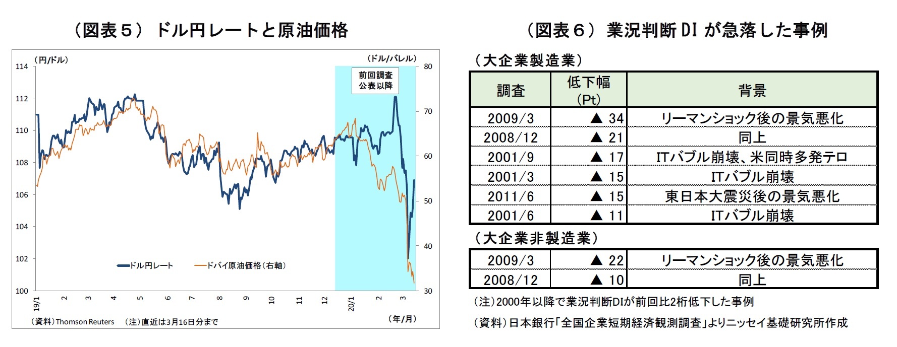 なお、今回の低下幅が過去の急落局面(図表6)よりも限定的に留まる理由は、短観には調査基準日(今回は3月11日)直前の状況を織り込みにくい傾向があるためである1。今回も、3月に入ってからの新型コロナ情勢の悪化はあまり織り込まれないと予想され、その分今回短観での低下幅は限定的になると考えられる。