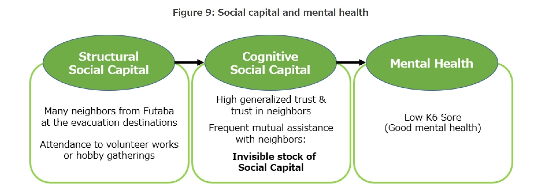 Moreover, we analyzed characteristics of those who chould keep good mental health under the tremendous disaster, and found that those who could keep good subjective health status after the disaster, those who have high income after the disaster and those who could keep high level of social capital tend to keep good mental health status after the disaster. As a mechanism connecting social capital and mental health, our study implied that high level of structural social capital helps people to have high level of cognitive social capital, which eventually helps people to keep good mental health (see Figure 9).