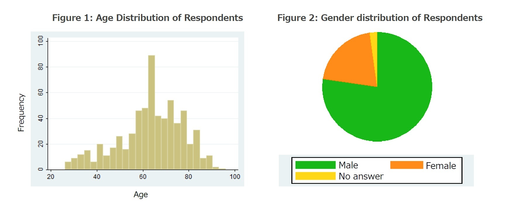 The survey targeted heads of households and Figures 1 and 2 show the distribution of age and gender of the respondents. As we can see from these figures, compared to the age and gender distribution reported in the national census, the age distribution of the respondents is left-skewed, with the majority of respondents in their 60s. The gender distribution shows that the majority of respondents are male. In addition, since the survey was conducted after the tremendous disaster, it is possible that the distributions of the respondents' characteristics are significantly different from those of general questionnaire surveys. Therefore, it should be noted that the results of this survey do not necessarily indicate the general trend of Futaba residents.