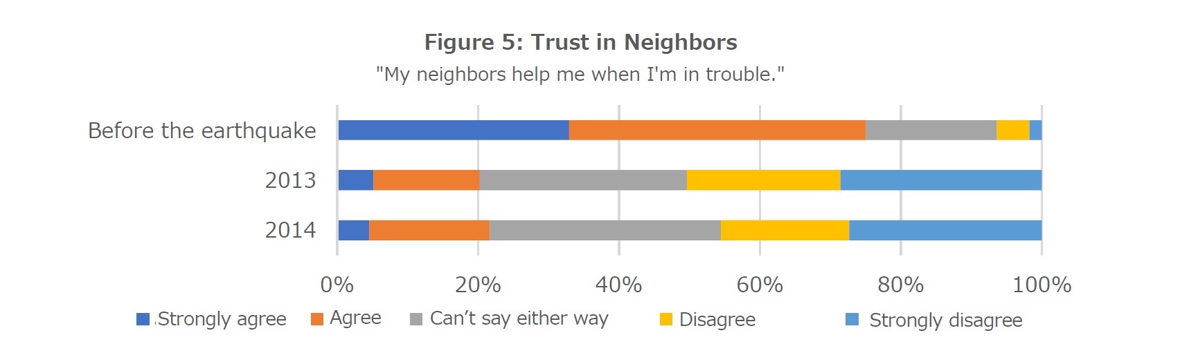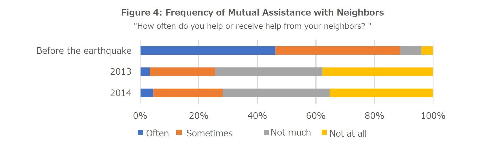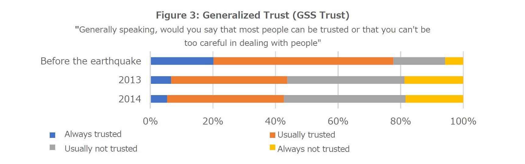 There are several indicators that are commonly used to measure social capital, but we focused on three items which are the level of "generalized trust", "frequency of mutual assistance with neighbors" and "trust in neighbors". As shown in Figure 3 to 5, all of these three indicators show that social capital has weakened because of the disaster and recovery trends cannot be observed so far. These indicate that it will take a very long time for social capital to recover, and we believe it is important to continue to monitor these changes over the long term.