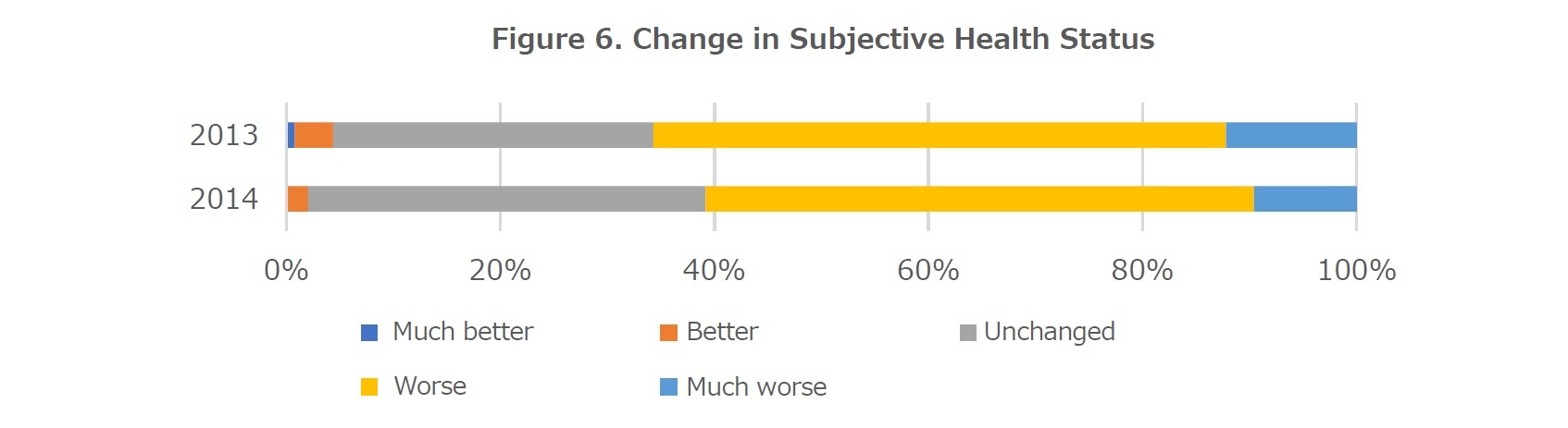 In addition, as to changes in income, health status, and living space caused by the disaster, we find that the greater the extent of decrease or deterioration is, the greater the degree of decline in individual well-being tends to be.