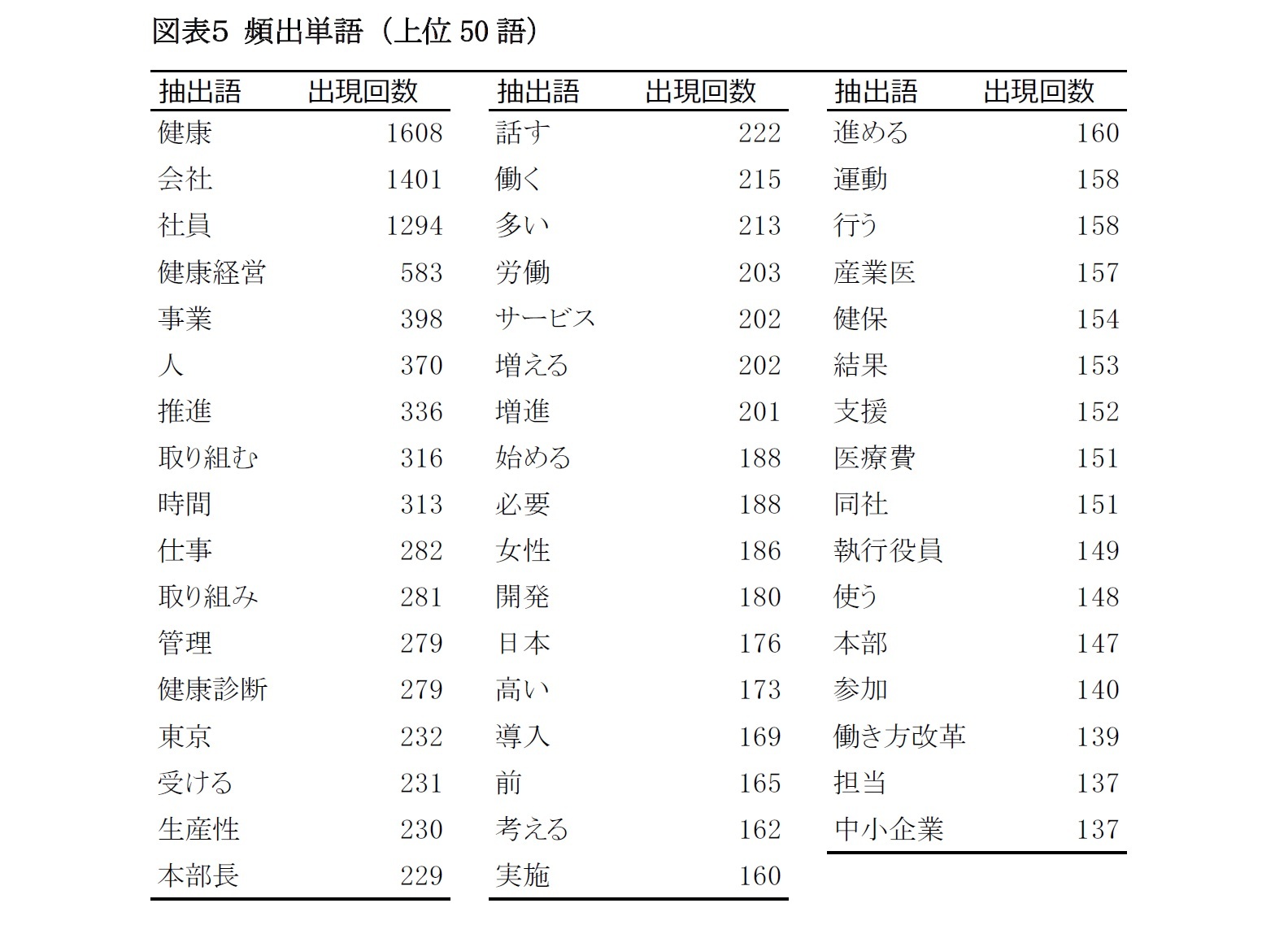 最も多く使われた単語は「健康」で1608回。その他、上位50語に含まれた健康に関連する単語には、「健康診断13」(279回)、「運動」(158回)、「産業医」(157回)、「健保」(154回)、「医療費」(151回)、が見られた。